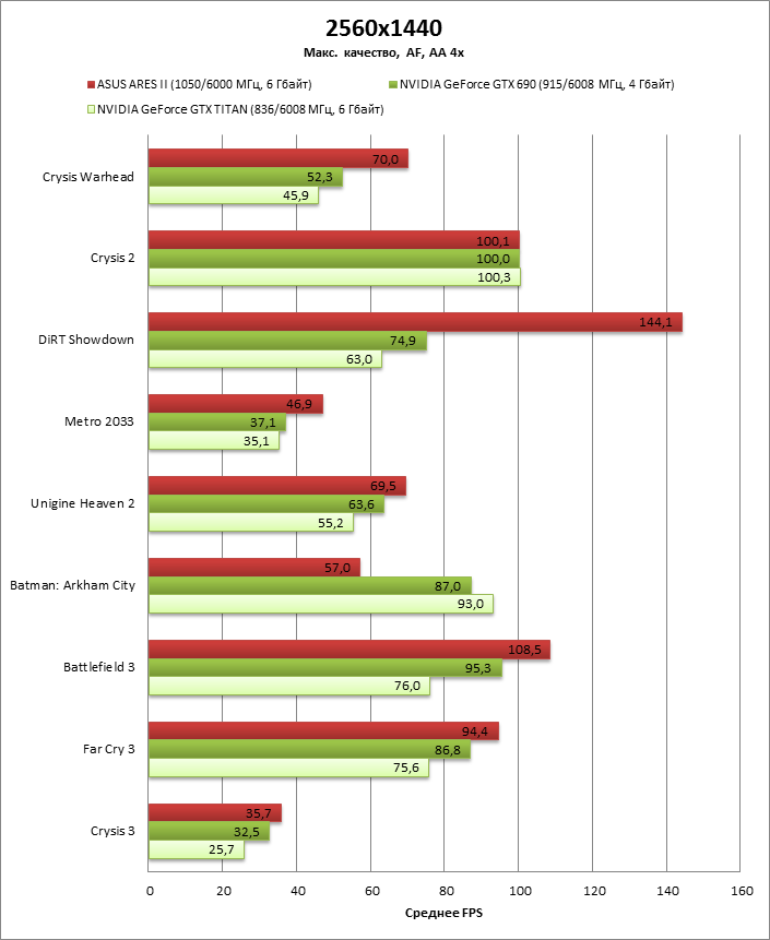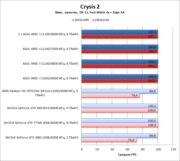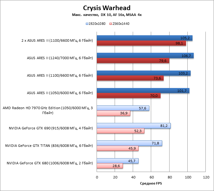 Как GeForce GTX 690, так и TITAN выдали меньше кадров в секунду, чем ARES II при разрешении 2560х1440, зато картам NVIDIA удалось пробить потолок около 100 FPS, в который уперлись все конфигурации с чипами AMD.