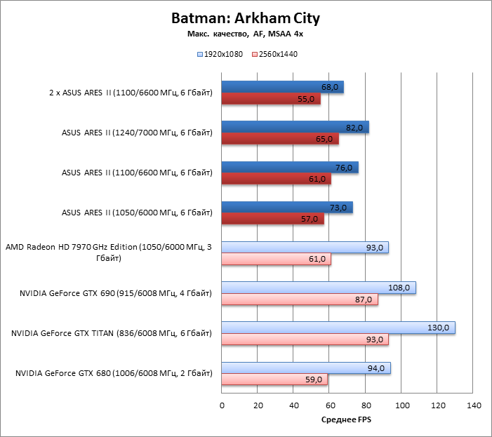 GTX 690 ощутимо отстает от ARES II, даже если последний работает на пониженных частотах. TITAN остался далеко позади обоих.