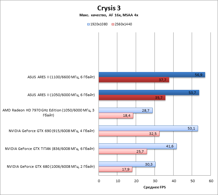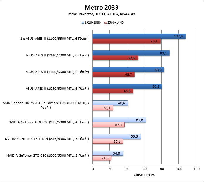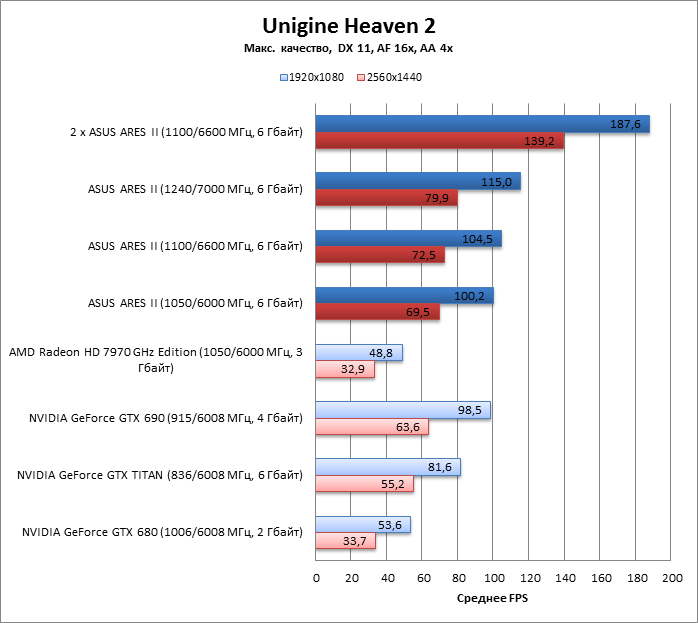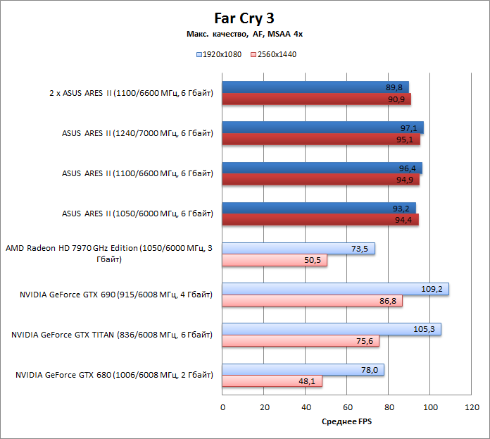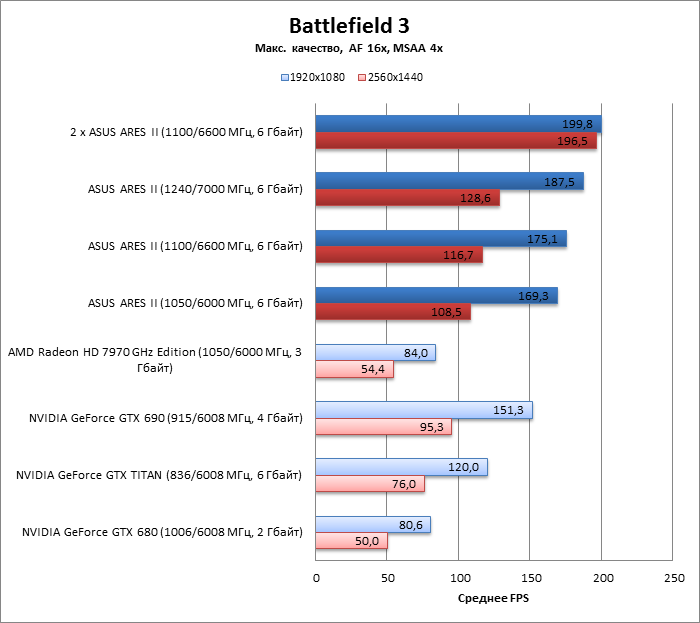 ARES II на частотах HD 7970 GHz Edition вдвое быстрее последнего, но лишь в разрешении 2560х1440.