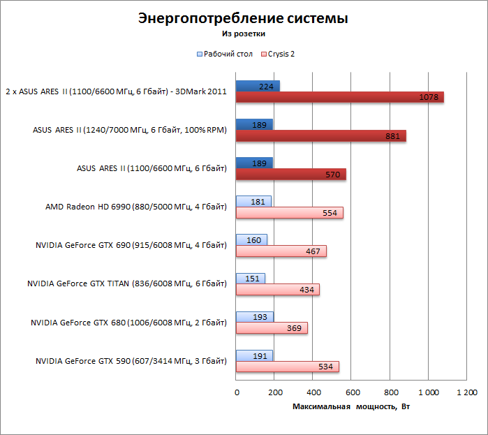 Система с парой ARES II на борту, работающими на штатных частотах, сосет из розетки вплоть до 1078 Вт — как слабенький электрочайник. Кстати, эти цифры получены с нагрузкой в 3DMark 2011, поскольку в нем мощь четырех GPU (по крайней мере GPU от AMD) задействуется в большей степени, чем в Crysis 2, который мы обычно применяем в тесте энергопотребления, но который остальные конфигурации «прогревает» лучше, чем 3DMark 2011.