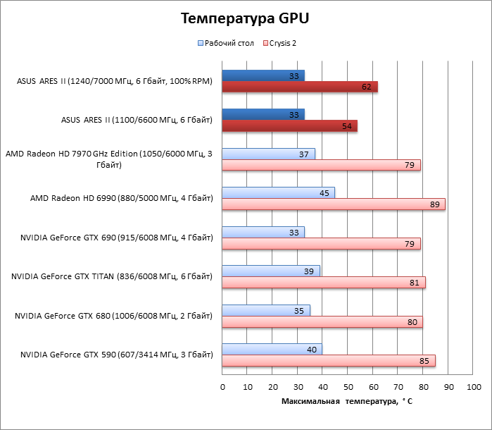 Замеры температуры показывают, что СВО на ARES II установлена не только для красоты. Предельная температура GPU под нагрузкой здесь на 25 °C меньше, чем у Radeon HD 7970 GHz Edition референсного дизайна, а в результате разгона поднимается только на 8 °C. А по сравнению с GK104 в составе GeForce GTX 690 предельная температура Tahiti XT2 в ARES II оказалась меньше на 31 °C – ровно столько, сколько обещала ASUS (правда-правда).