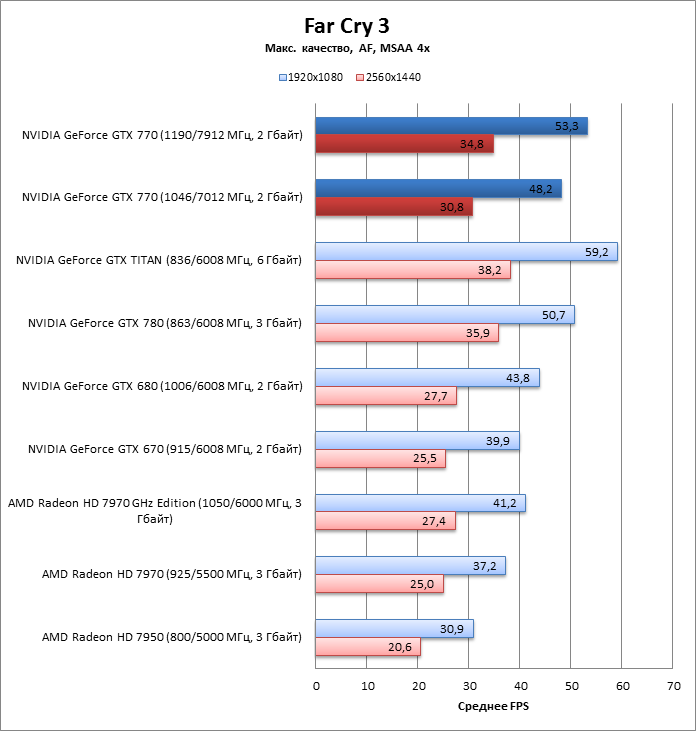 Замена GeForce GTX 680 на GTX 770 ничего принципиально не меняет в соотношении игровой производительности видеокарт NVIDIA и AMD. Radeon HD 7970 GHz Edition является примерным эквивалентом GTX 680 и стоит сопоставимых денег. Следовательно, GTX 770 также превосходит его, но также совсем ненамного.