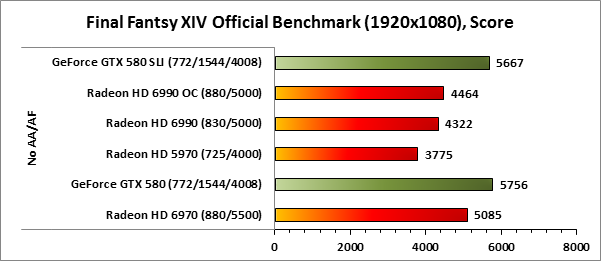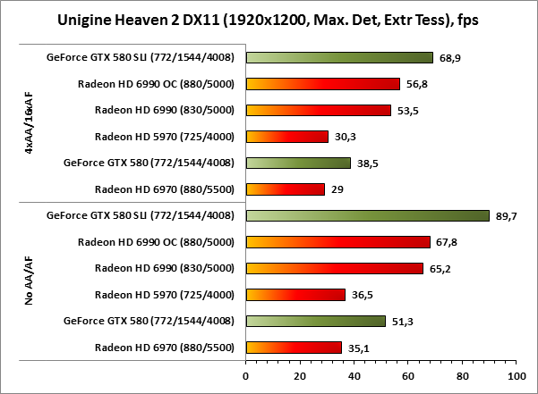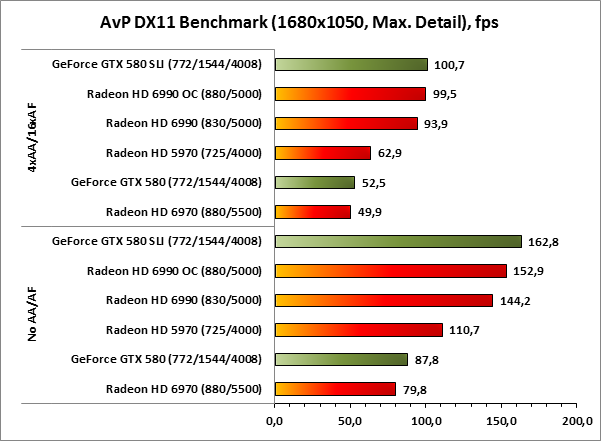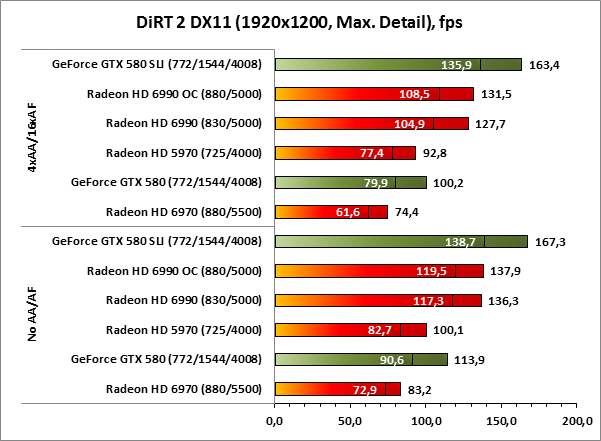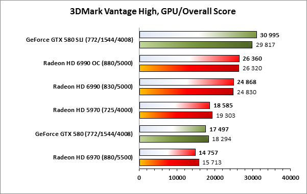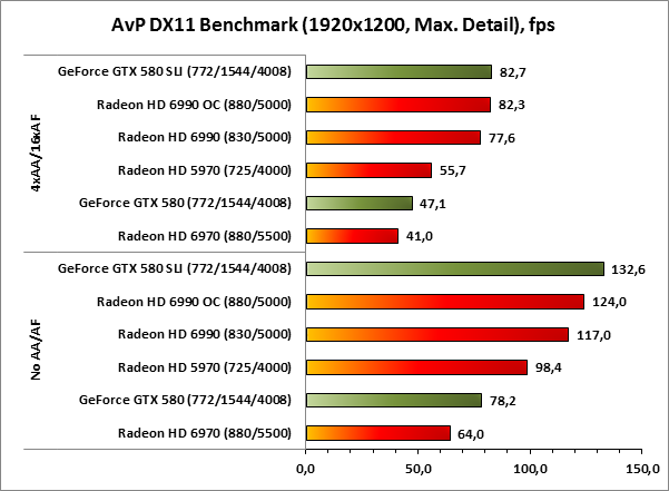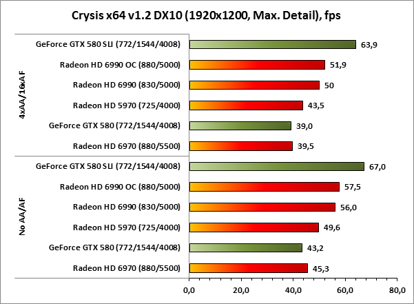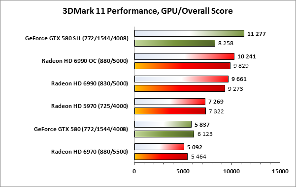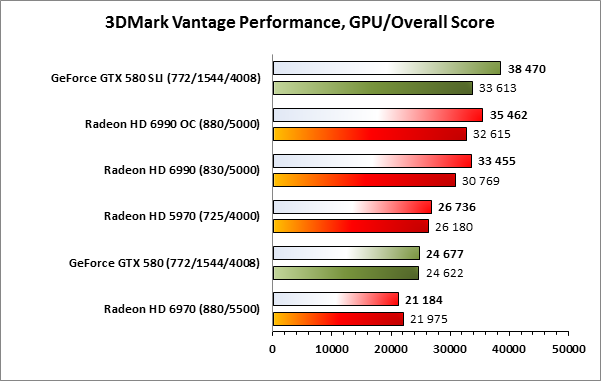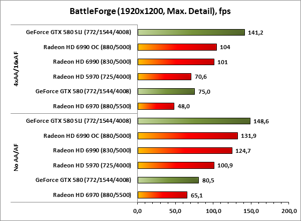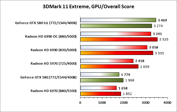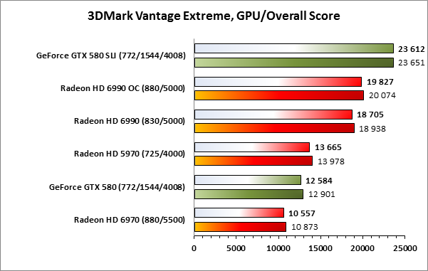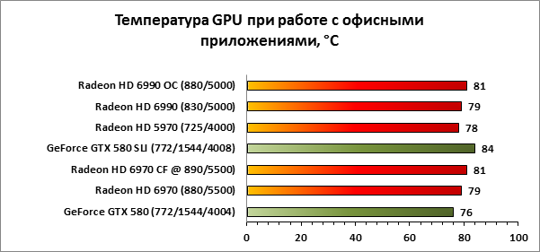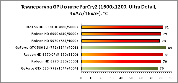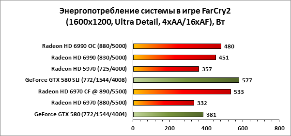 К сожалению, из списка тестируемых игр для данного обзора нам пришлось исключить HAWX 2. Дело в том, что после очередного обновления игра категорически отказывалась запускаться, несмотря на все ухищрения и неоднократную переустановку. Температура GPU и энергопотребление системы ![]() ![]() Вопреки нашим ожиданиям, температура GPU Radeon HD 6990 как в офисном режиме, так и в режиме типичной игровой нагрузки не достигала критических значений. Даже после активации заводского разгона AMD температура ядер не поднялась выше 81 градуса Цельсия. Весьма неплохо для столь мощного ускорителя. В сравнении с HD 6990 пара GTX 580 SLI прогрелась чуть сильнее, до 84 градусов. Что же касается уровня шума, то здесь новинка показала себя не с лучшей стороны. Вой турбины достаточно чётко выделялся из общего шума, создаваемого тестовым стендом. При этом нельзя сказать, что издаваемый СО Radeon HD 6990 шум давит на слух так же, как это делала турбина GeForce FX 5800 Ultra, если вы помните, что это такое. ![]() ![]() Что касается энергопотребления тестового стенда с установленной видеокартой Radeon HD 6990, то здесь никаких сюрпризов нет. Такая система потребляет на 70-100 Вт больше (в зависимости от рабочих частот), чем аналогичная система с одной видеокартой GeForce GTX 580. C одной стороны, это достаточно много, с другой — энергопотребление системы вполне соответствует уровню производительности, который, по нашим оценкам, у Radeon HD 6990 заметно выше, чем у GTX 580. В то же время близкая с точки зрения производительности связка Radeon HD 6970 CrossFireX, установленная в этот же стенд, потребляет заметно больше Radeon HD 6990 OC, так что и здесь новинка AMD также выглядит весьма неплохо. ![]() ![]() ![]() В первом же синтетическом тесте новый Radeon HD 6990 оказывается на голову сильнее GeForce GTX 580, особенно после включения фирменного турборежима AMD. Эффективно противостоять HD 6990 может лишь SLI-связка из пары GTX 580, вот только стоит она почти на треть дороже HD 6990. ![]() ![]() В 3DMark 11 ситуация повторяется, правда, в отличие от Vantage, здесь преимущество GeForce GTX 580 SLI ощущается лишь в GPU Score, в то время как общий балл оказывается ниже, чем у Radeon HD 6990. Такое поведение 3DMark 11 в отношении SLI-связки ускорителей NVIDIA можно списать лишь на некорректное поведение драйверов — другого объяснения у нас не нашлось. Тестирование видеокарт в DX10/11-синтетике хоть и показательно, но не является адекватным мерилом скорости в современных играх, определяя лишь примерный уровень производительности ускорителей. Переходим к реальным игровым тестам. ![]() ![]() В BattleForge производительность Radeon HD 6990 на высоте, новинка от AMD опережает GeForce GTX 580 примерно на 60%, хотя результаты зависят от режима. Откровенно говоря, нас удивляет более чем 100% прирост результатов Radeon HD 6990 в сравнении с Radeon HD 6970. Повторение тестов на Radeon HD 6990 ситуацию не изменило. В будущих обзорах мы ещё обратим внимание на поведение видеокарт в этой игре, к тому времени как раз подоспеют новые драйверы. ![]() ![]() В DiRT 2 отставание GTX 580 от соперника не так велико, однако всё равно достаточно заметно. Обратите внимание: активация полноэкранного сглаживания снижает производительность не более чем на 5%, что абсолютно незаметно во время игры. ![]() ![]() В Crysis графические ускорители AMD чувствуют себя явно увереннее конкурентов, показывая заметно более высокие результаты в любых режимах.