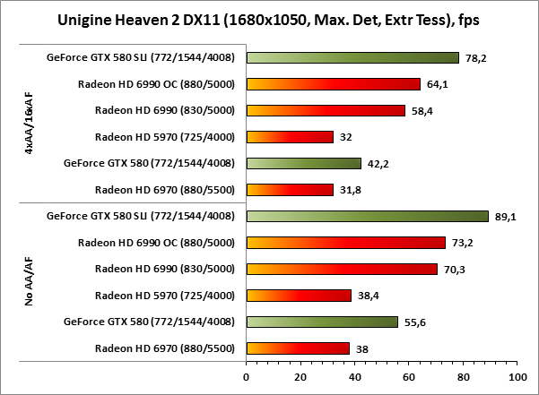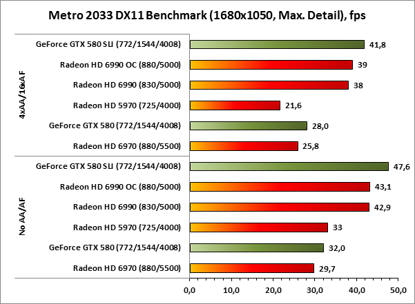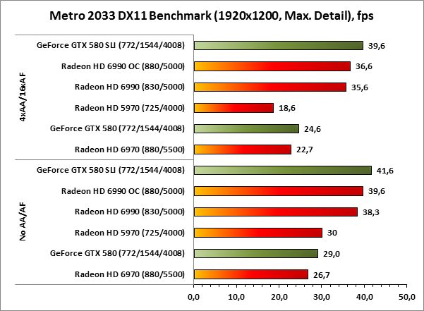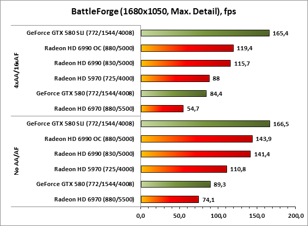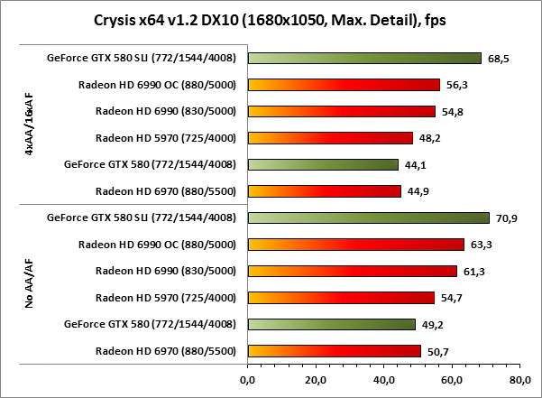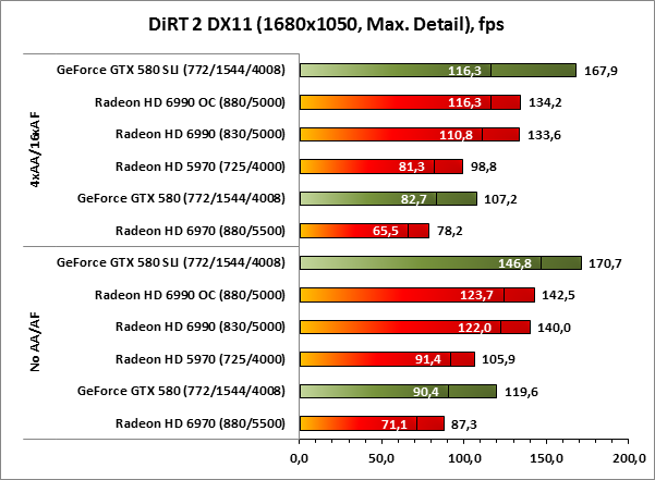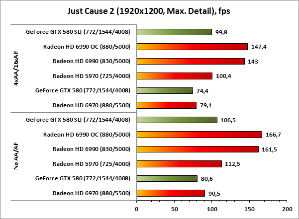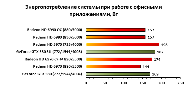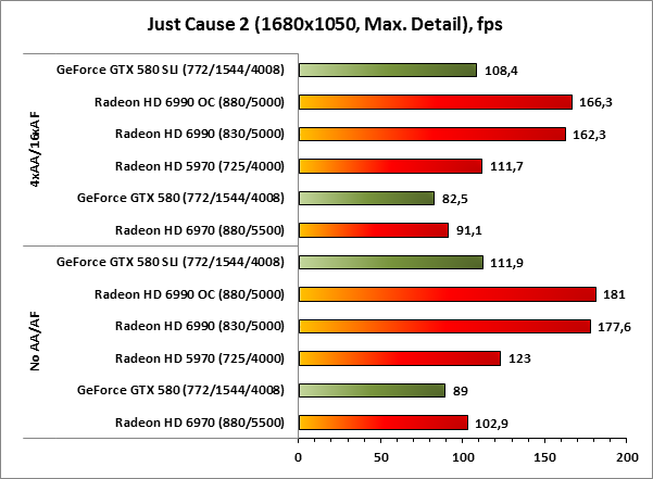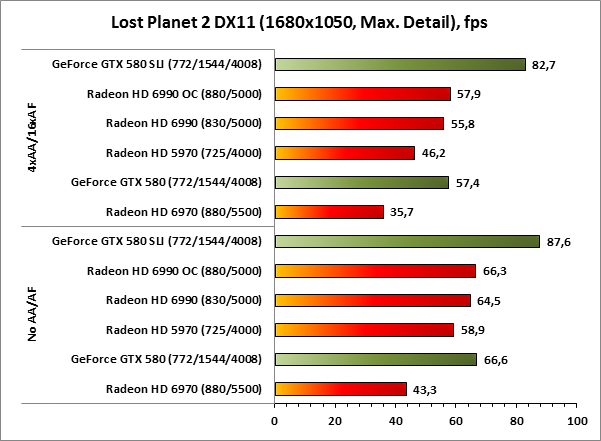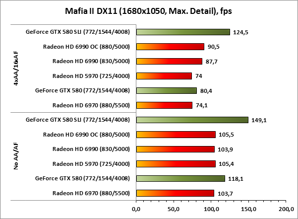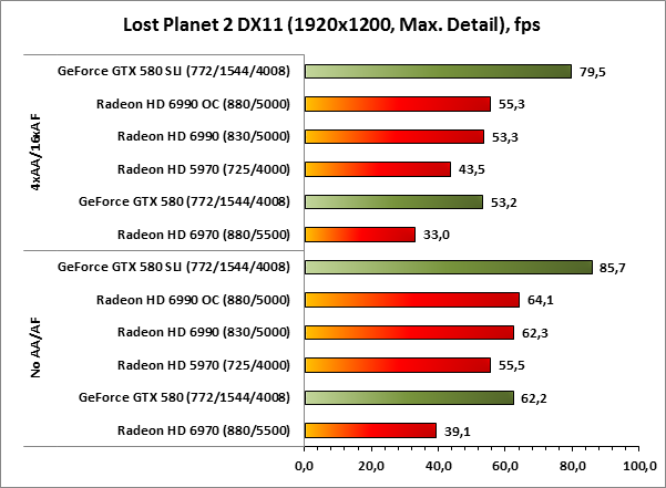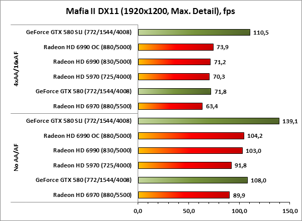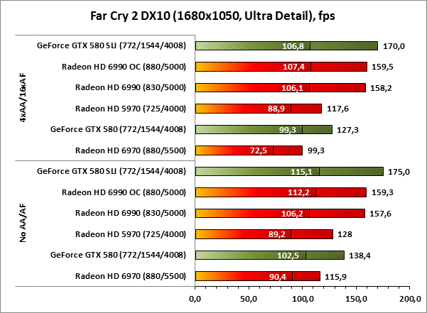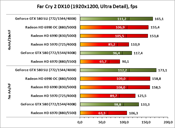 ![]() ![]() В Far Cry 2 разница между результатами разогнанной и неразогнанной версии Radeon HD 6990 исчезающе мала, впрочем, как и разница между рабочими разрешениями, а также режимами сглаживания. Это может говорить о недостаточной ПСП, ограничивающей мощь графического ядра вместе с пределом вычислительных способностей CPU, в который и «упёрся» наш герой. ![]() ![]() В Just Cause 2 ускоритель Radeon HD 6990 обогнал даже GeForce GTX 580 SLI! Впечатляет. ![]() ![]() В самых тяжёлых режимах показатели производительности GTX 580 SLI находятся примерно на одном уровне с таковыми у Radeon HD 6990. Ещё один балл в копилку AMD. ![]() ![]() ![]() Несмотря на активное использование тесселяции, рост частоты GPU Radeon HD 6990 после переключения BIOS не сильно повлиял на результат. В разрешении 1920x1200 производительность HD 6990 очень близка к показателям GTX 580 SLI. ![]() ![]() А вот в Lost Planet 2 одночиповый продукт NVIDIA лишь слегка недотягивает до показателей Radeon HD 6990 OC, и то лишь формально, фактически же наблюдается паритет. Есть над чем работать программистам AMD. ![]() ![]() Наконец-то ускоритель AMD, пусть и двухчиповый, поборол флагмана NVIDIA в тесте, по максимуму использующем тесселяцию. Выигрыш HD 6990 колеблется около 30% отметки в зависимости от режима. ![]() ![]() В Mafia II играть с комфортом можно на любой из представленных видеокарт, правда, у Radeon HD 6990 не происходит масштабирование результатов от появления второго чипа. Максимум, на что способна новинка в этой игре, — паритет или небольшой выигрыш у GeForce GTX 580 в тяжёлых режимах и отставание — в лёгких. ⇡#ВыводыСудя по полученным нами данным, производительность ускорителя AMD Radeon HD 6990 в целом на голову выше тех результатов, которыми может похвастать GeForce GTX 580, даже в тех приложениях, которые всегда были коньком NVIDIA. При этом новинка от AMD обладает неплохими для своего класса производительности показателями энергопотребления, да и температуру GPU стандартная система охлаждения удерживает в безопасных пределах. Единственное, что немного огорчает, так это заметный шум турбины при работе карты в 3D. Итого: перед нами самый быстрый графический ускоритель в мире, без каких-либо натяжек, а свойственные таким продуктам недостатки инженеры AMD попытались свести к минимуму. В дополнение к вышесказанному отметим, что компания AMD не зря продвигает режимы улучшения качества картинки, а также технологию Eyefinity. Поведение Radeon HD 6990 в выбранных нами режимах говорит о том, что во многих играх потенциал новинки будет раскрыт только в сверхтяжёлых режимах, таких как Eyefinity-разрешения или более высокие разрешения на одном мониторе, но в паре с качественными режимами полноэкранного сглаживания. ![]()
