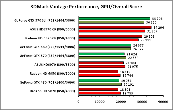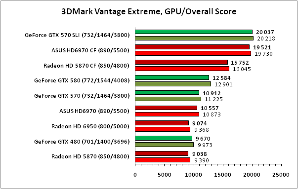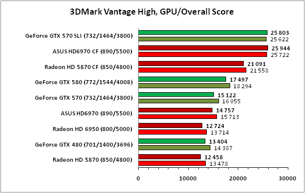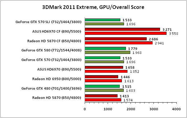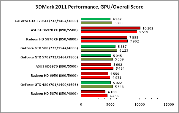 К сожалению, в 3DMark 11 точных данных о производительности SLI-связки из ускорителей GeForce GTX 570 получить не удалось в силу отсутствия поддержки соответствующего SLI-профиля в используемом нами драйвере NVIDIA, поэтому результаты, внесённые на графики, не отражают реальной расстановки сил. Что же касается значений, полученных на Radeon HD 6970 CrossFireX производства ASUS, то при добавлении в систему второй видеокарты в тяжёлых режимах прирост составил более 90%, что можно считать отличным показателем, несколько лучшим, чем демонстрирует CrossFireX-связка из пары Radeon HD 5870.