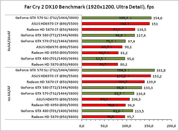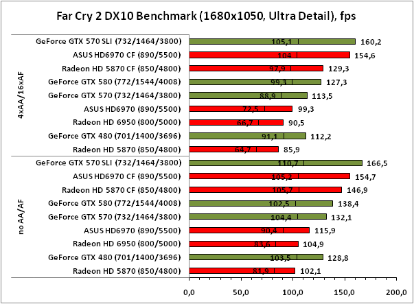 А вот в Far Cry 2 пара ускорителей Radeon HD 6970 чувствует себя заметно лучше, причём не только в сравнении со старичками Radeon HD 5870 CrossFireX, но даже рядом с GeForce GTX 570 SLI. Только это всё равно не помогает новинке на базе GPU AMD Cayman обогнать GTX 570 SLI.