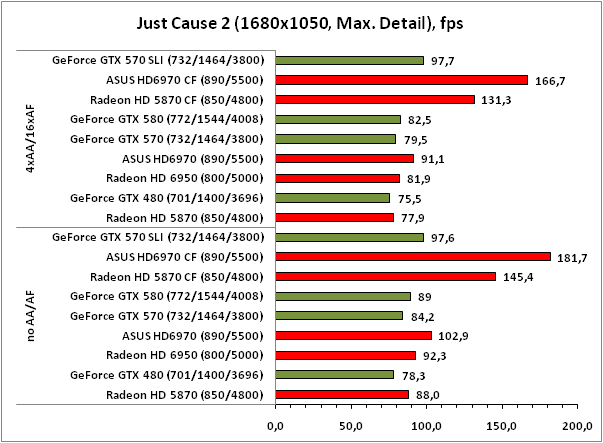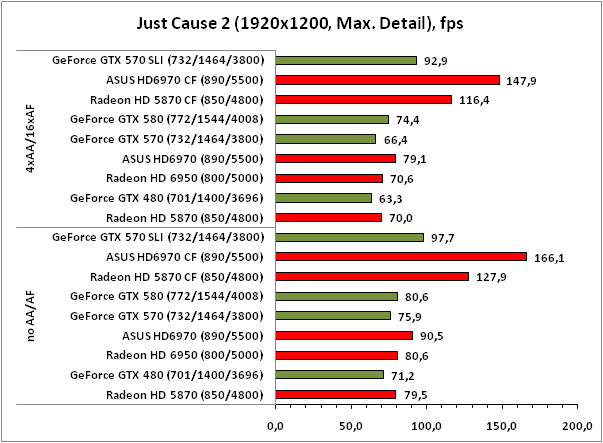 Комментировать расстановку сил в игре Just Cause 2 особого смысла нет, ввиду тотального превосходства решений AMD. А вот о масштабируемости CrossFireX-связки сказать стоит. В случае с ASUS HD6970 CrossFireX прирост от установки второй видеокарты составляет 75-85% в зависимости от режима, что определённо лучше, чем у тандема Radeon HD 5870 CF, который прибавляет в производительности на 10-15% меньше.