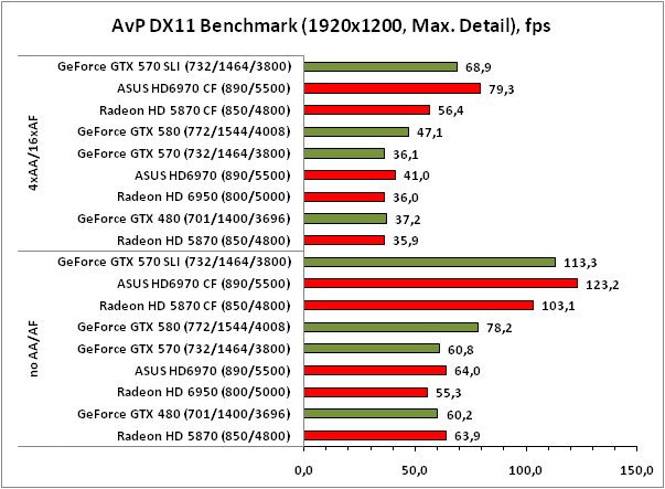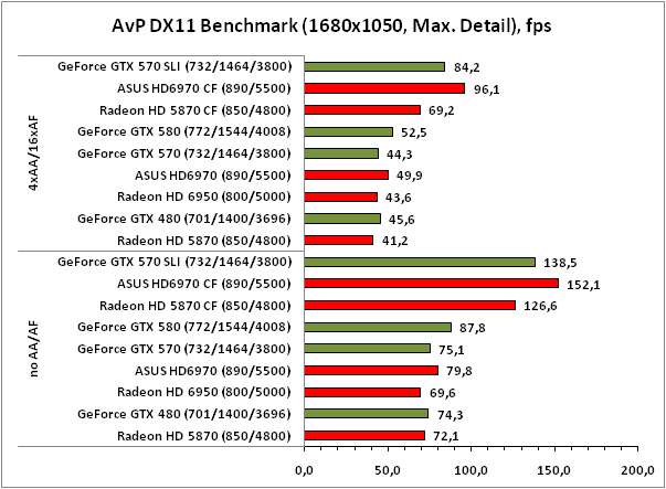 | Alien versus Predator DX 11 Benchmark | Очень высокая детализация, 1920x1200/ 1680x1050 no AA/AF Очень высокая детализация, 1920x1200/ 1680x1050 4xAA/AF |