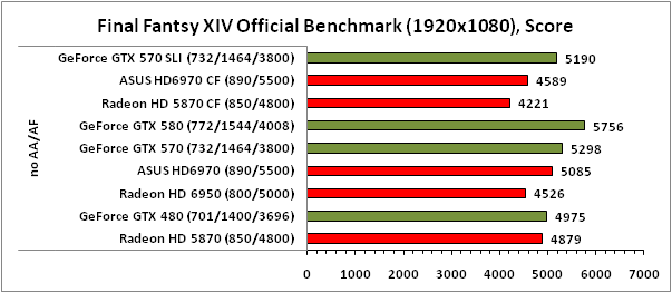 Игра Final Fantasy XIV не жалует тандемы из нескольких видеокарт — наши измерения показывают, что активация SLI/CrossFireX приводит к снижению производительности, в итоге лидирующие позиции занимают одиночные ускорители GeForce GTX 580, GTX 570 и Radeon HD 6970 в исполнении ASUS.