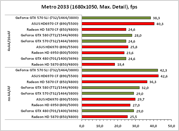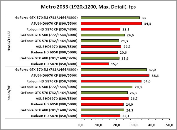 В игре Метро 2033 решения от AMD не демонстрируют выдающихся показателей масштабируемости вне зависимости от разрешения и настроек полноэкранного сглаживания, впрочем, продукты NVIDIA также не блещут высоким КПД после установки в систему второй видеокарты. Что касается расстановки сил, то в целом с небольшим перевесом победу одерживает ASUS HD6970 CrossFire, следом идёт GeForce GTX 570 SLI, а на третьем месте в лёгких режимах оказывается Radeon HD 5870 CrossFire, в тяжёлых — одночиповый флагман NVIDIA — GeForce GTX 580.