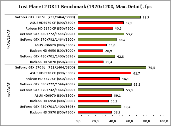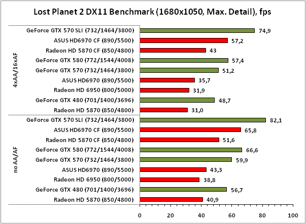 В Lost Planet 2 лидирует GeForce GTX 570 SLI, а вот за второе место идёт ожесточённая борьба между Radeon HD 6970 CrossFireX и GeForce GTX 580.