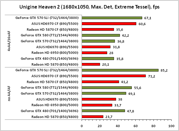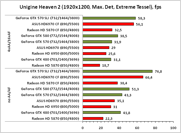 Так уж сложилось, что блок тесселяции у продуктов AMD не так силён, как у представителей NVIDIA. Даже после серьёзной доработки GPU Cayman, Radeon HD 6970, как и тандем из пары таких ускорителей, не способен победить GeForce GTX 570 SLI с экстремальными настройками тесселяции в Unigine Heaven 2.