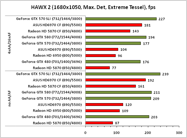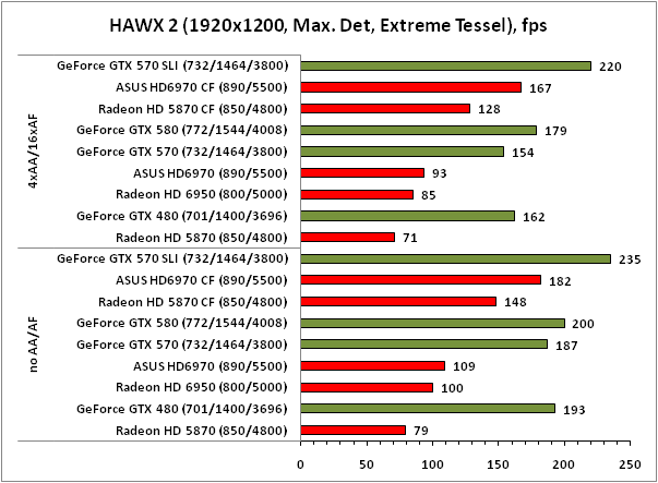 Аналогичная ситуация наблюдается и в случае с игрой HAWX 2. Здесь правит бал NVIDIA, тандем ASUS HD6970 CF в состоянии догнать лишь одну GeForce GTX 570, и то не везде.