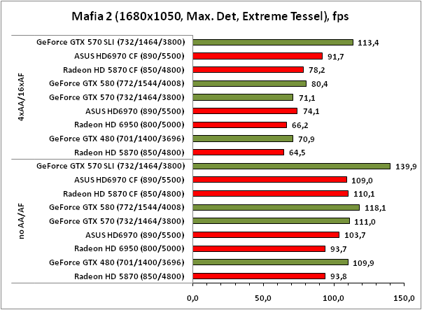Масштабирование результатов при включении CrossFireX/SLI в игре Mafia II оставляет желать лучшего: прирост есть, но он невелик и составляет не более 50%.