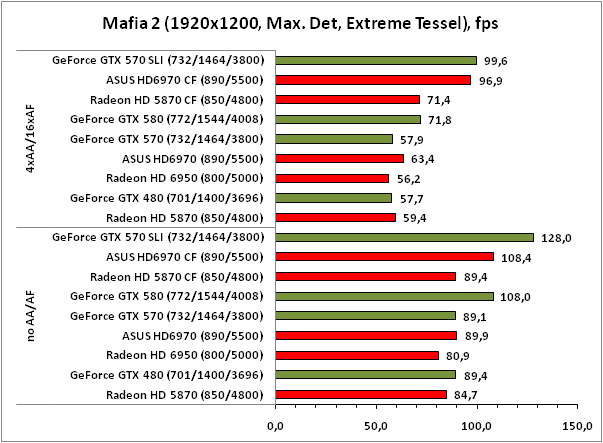 | Mafia II | Максимальная детализация, 1920x1200/ 1680x1050 no AA/AF, технология NVIDIA PhysX выключена Максимальная детализация, 1920x1200/ 1680x1050 no 4xAA/16xAF, технология NVIDIA PhysX выключена |