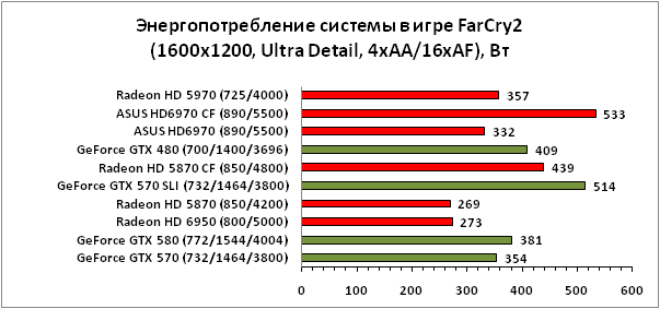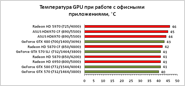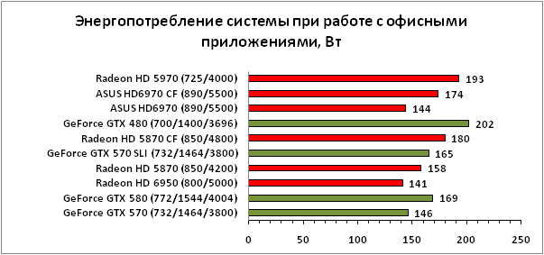 Что же касается энергопотребления системы, то здесь расстановка сил такова: самой экономичной связкой, если не рассматривать Radeon HD 5970, можно признать Radeon HD 5870 CrossFireX, следом за ним идёт GeForce GTX 570 SLI, а наибольший аппетит проявляет связка из пары ASUS HD6970. Справедливости ради отметим, что разница между ASUS HD6970 CrossFireX и GTX 570 SLI невелика, особенно в режиме офисной работы.