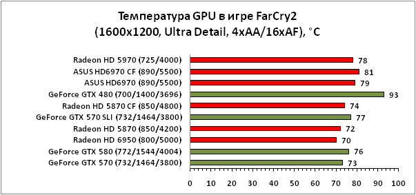 Температура GPU в тандемах, как и предполагалось, оказалась несколько выше, чем в случае с одиночными решениями, однако рост температуры при типичной игровой нагрузке нельзя назвать критичным. Лидером среди связок стала CrossFireX-пара ускорителей Radeon HD 5870, следом идёт SLI-тандем GeForce GTX 570 и, наконец, самой горячей парой оказалась упряжка из двух ASUS HD6970 CF, хотя разница с GeForce GTX 570 SLI невелика и составляет всего 4 °C.