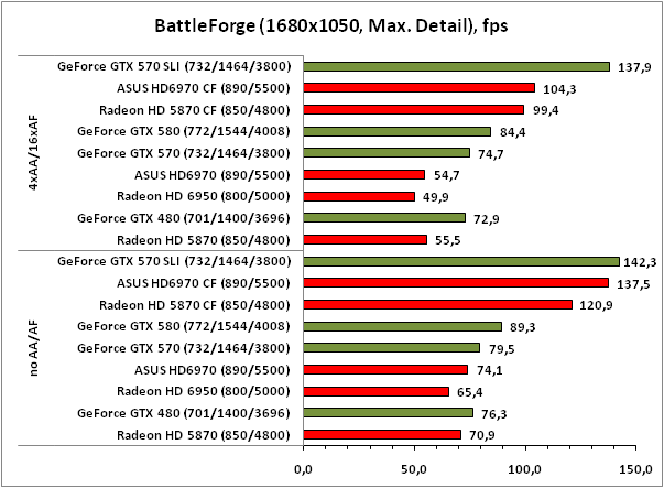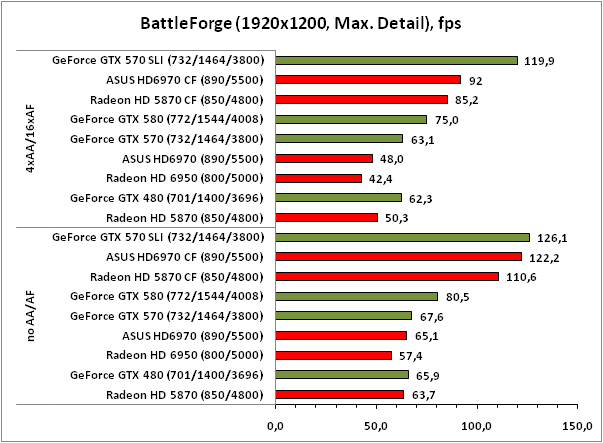 Несмотря на хорошую масштабируемость результатов в CrossFireX-тандеме ASUS HD6970, абсолютные показатели производительности этой связки в BattleForge всё-таки ниже оных у GeForce GTX 570 SLI, особенно это заметно в тяжёлых режимах с полноэкранным сглаживанием и анизотропной фильтрацией. Впрочем, отставание от конкурента вовсе не означает малое количество FPS – играть на ASUS HD6970 CrossFireX можно с комфортом даже в самых тяжёлых режимах. Кстати, как и было обещано на презентационном слайде AMD, масштабируемость результатов в CrossFireX-связке Radeon HD 6970 стала заметно лучше, чем в случае с парой Radeon HD 5870, по крайней мере, в игре BattleForge (разница в масштабируемости составляет порядка 15-20% в пользу Radeon HD 6970 производства ASUS).