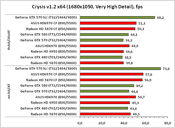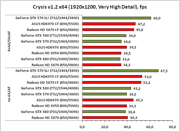 В Crysis прирост от установки второго ускорителя в пару к Radeon HD 5870 или Radeon HD 6970 не превышает 30%, что вовсе не радует. Тем временем GeForce GTX 570 SLI демонстрирует хорошую масштабируемость: порядка 70% прироста в сравнении с одной GTX 570. Благодаря существенному росту результатов, SLI-тандему из GTX 570 удалось-таки обогнать всех остальных участников теста во всех без исключения режимах.