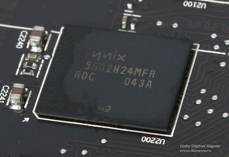 На ASUS HD6970 установлена память Hynix H5GQ2H24MFR, суммарный объём которой составляет 2 Гбайт, а номинальная тактовая частота — 6 ГГц (QDR).