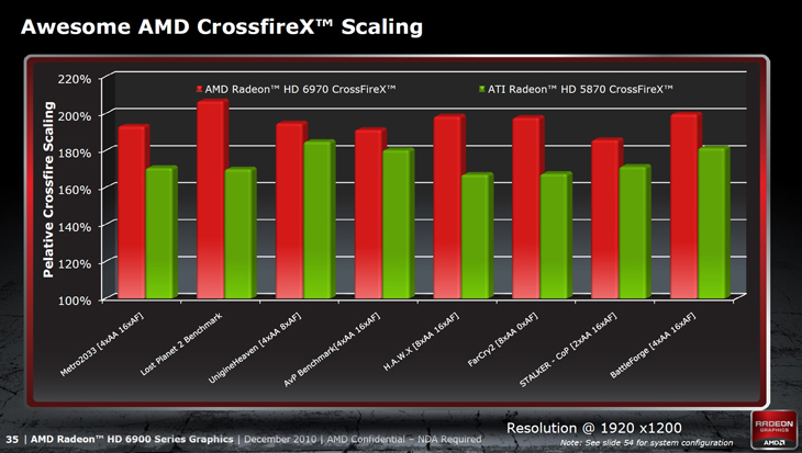 В такой ситуации от «процессорно-графического» гиганта ждали молниеносного и точного удара по позициям конкурентов, многие потирали руки в предвкушении анонса следующего флагмана — Radeon HD 6970. Однако, вопреки ожиданиям публики, AMD выпустила пару ускорителей, самый мощный из которых, Radeon HD 6970, составил конкуренцию лишь GeForce GTX 570. Впрочем, для большинства пользователей производительности Radeon HD 6970 будет вполне достаточно, ну а любители самой быстрой езды вряд ли остановятся на одной видеокарте, скорее всего, они предпочтут использовать всевозможные типы связок, самой популярной из которых можно считать тандем. Во время анонса Radeon HD 6970 представители компании AMD особо подчеркнули, что при переходе на новую WLIW4 архитектуру одной из целей инженеров и программистов компании была оптимизация производительности CrossFireX-конфигураций за счёт увеличения КПД при добавлении в систему дополнительных ускорителей. Об этом недвусмысленно говорит презентация AMD, в которой демонстрируется процентное преимущество пары Radeon HD 6970 над Radeon HD 5870 CrossFireX.