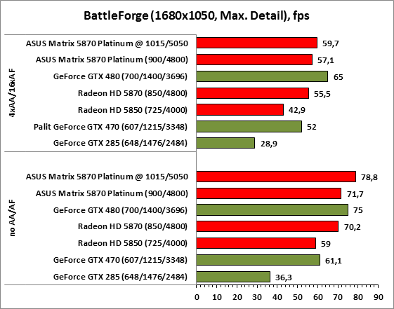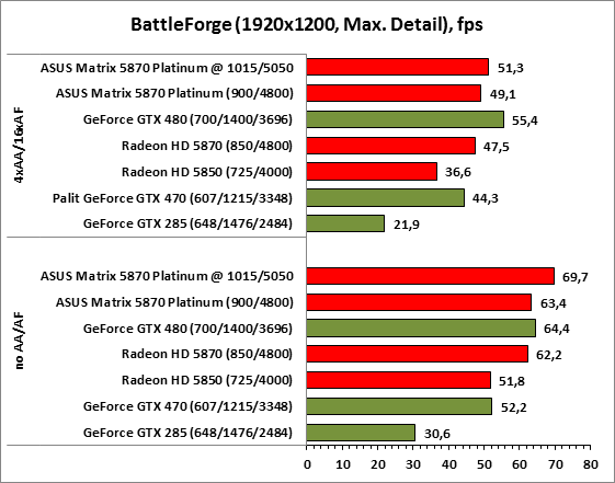 Без полноэкранного сглаживания и анизотропной фильтрации в игре Battle Forge разница между эталонной версией Radeon HD 5870, ASUS Matrix 5870 Platinum и GeForce GTX 480 невелика. Активация режима 4xAA/16xAF заставляет отступить видеокарты на основе чипа Cypress, и даже нешуточный разгон не позволил ASUS Matrix 5870 Platinum отобрать пальму первенства у GeForce GTX 480.