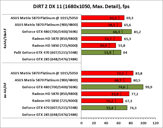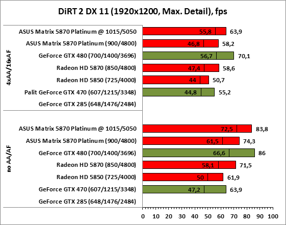 Во всех режимах движок DiRT 2 демонстрирует преимущество ASUS Matrix 5870 Platinum в сравнении с эталонной версией Radeon HD 5870, что неудивительно, ведь детище ASUS имеет более высокую частоту GPU. Различие в объёме видеопамяти, установленной на этих ускорителях, в таких разрешениях вряд ли где проявится, но, безусловно, внесёт свою лепту при игре в сверхвысоких Eyefinity-разрешениях. Ручной разгон ASUS Matrix 5870 Platinum позволяет поднять планку производительности HD 5870 от ASUS ещё выше, однако до уровня производительности GeForce GTX 480 удаётся дотянуться лишь в разрешении 1920x1200 без полноэкранного сглаживания и фильтрации.