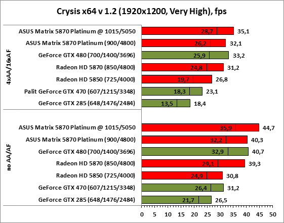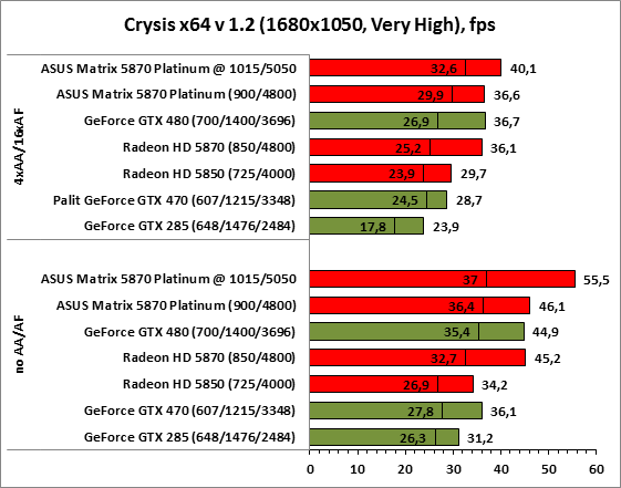 В Crysis не произошло ничего сверхъестественного, ASUS Matrix 5870 Platinum, даже без ручного разгона, выглядит, как минимум, не хуже GeForce GTX 480, а иногда даже лучше. После разгона детище ASUS отрывается от всех конкурентов и даже в самых тяжёлых режимах обеспечивает отличную производительность.