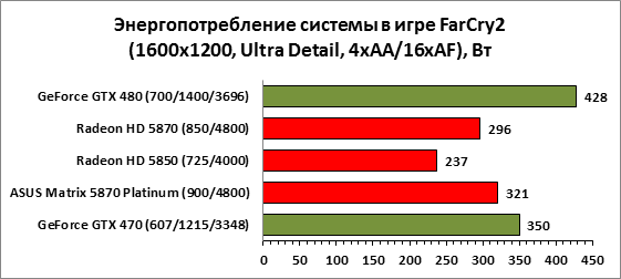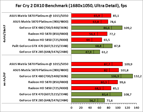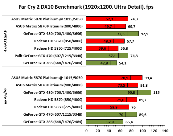 Несмотря на очень высокую производительность ASUS Matrix 5870 Platinum в Far Cry 2, даже после разгона детище ASUS всё равно уступает по производительности топ-модели NVIDIA. Отрыв видеокарты ASUS от эталонного образца Radeon HD 5870 не велик, и больше всего проявляется в разрешении 1920x1200 с включённым сглаживанием и фильтрацией.