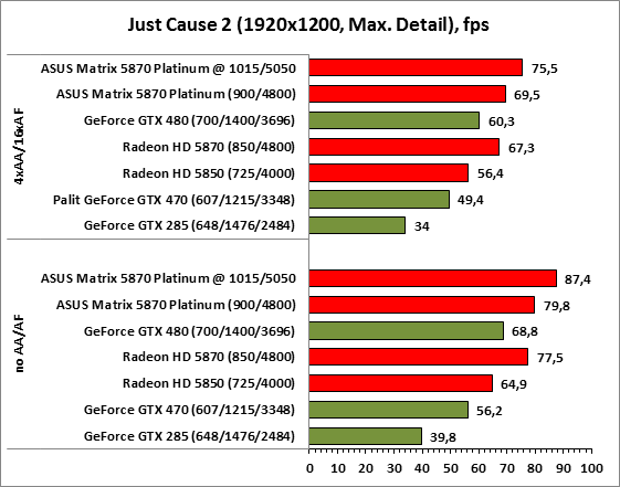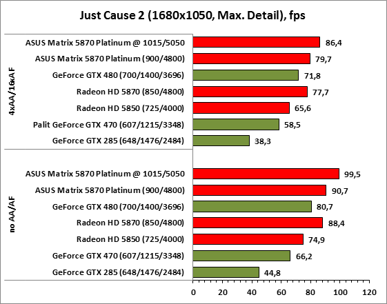 Игра Just Cause 2 отдаёт предпочтение продуктам на чипах AMD. Видеокарта ASUS Matrix 5870 Platinum, даже без разгона, заметно обходит своего главного оппонента – ускоритель GeForce GTX 480. А после повышения тактовых частот детище NVIDIA вынуждено и вовсе “глотать пыль”.