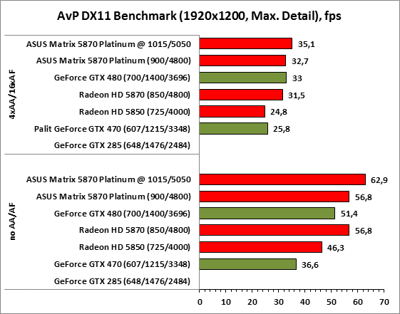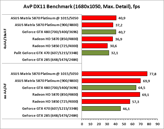 В AvP DX11 Benchmark ситуация следующая. До тех пор, пока в игре не включено сглаживание и анизотропная фильтрация, ASUS Matrix 5870 Platinum без труда обходит NVIDIA GeForce GTX 480. Однако после активации режимов улучшения качества картинки, у видеокарты GeForce GTX 480 открывается “второе дыхание”, и в таких условиях она уже вполне может соперничать с разогнанной видеокартой ASUS Matrix 5870 Platinum.