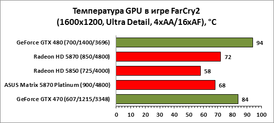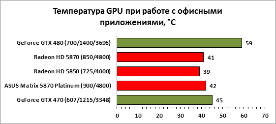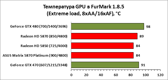 Когда тестируемые ускорители находятся в состоянии покоя, температура GPU эталонной версии Radeon HD 5870 и ASUS Matrix 5870 Platinum не различаются. А вот под нагрузкой система охлаждения ASUS Matrix 5870 Platinum выигрывает у эталонной СО примерно 4-5 °С, что весьма неплохо, особенно учитывая завышенную по умолчанию частоту GPU Matrix 5870 Platinum. Что касается продуктов NVIDIA, то на их фоне и обычные ускорители Radeon HD 5870/5850 выглядят весьма уверенно.