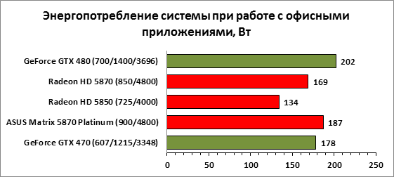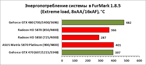 Энергопотребление системы с установленной видеокартой ASUS Matrix 5870 Platinum во всех режимах несколько выше, чем энергопотребление этой же системы с эталонной видеокартой Radeon HD 5870. Это связано с тем, что тактовая частота ядра Matrix 5870 Platinum на 50 МГц выше, чем у эталона. По показателям энергопотребления новинка находится примерно на уровне с GeForce GTX 470, которая, при этом, в большинстве современных игр окажется медленнее нашего сегодняшнего героя.