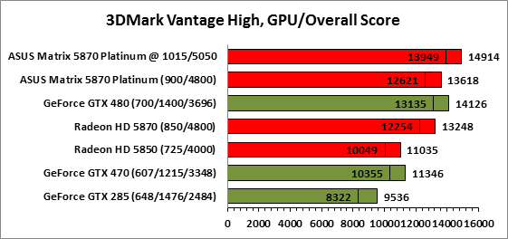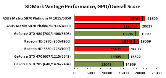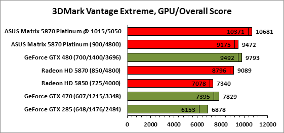 Результаты тестирования в 3DMark Vantage в режиме Performance демонстрируют небольшое преимущество ASUS Matrix 5870 Platinum над не разогнанной видеокартой GeForce GTX 480. Однако, с переходом к более качественным профилям, новинка ASUS немного уступает топ-модели NVIDIA. Зато разгон позволяет ASUS Matrix 5870 Platinum уверенно лидировать во всех режимах.