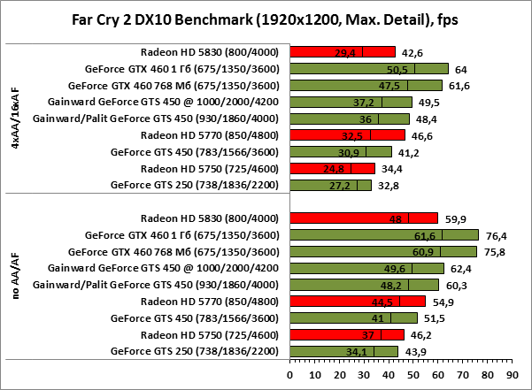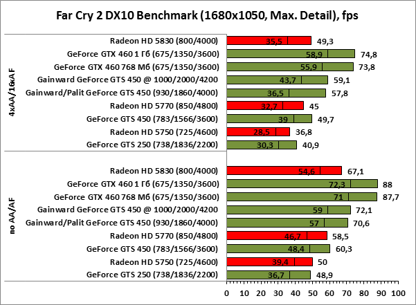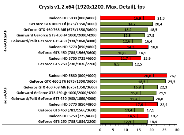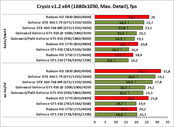 В Crysis старичок GeForce GTS 250 достойно выступает на фоне конкурентов, в некоторых случаях даже догоняя Radeon HD 5750 или эталонную версию GeForce GTS 450. Что касается противостояния GeForce GTS 450 с представителями красного лагеря, то здесь ситуация такова: эталонный образец GeForce GTS 450 выступает примерно на уровне HD 5750, однако всё же чуть отстаёт от него. В свою очередь, разогнанные версии от Palit и Gainward хоть и обходят Radeon HD 5750, но результаты Radeon HD 5770 по-прежнему лучше.