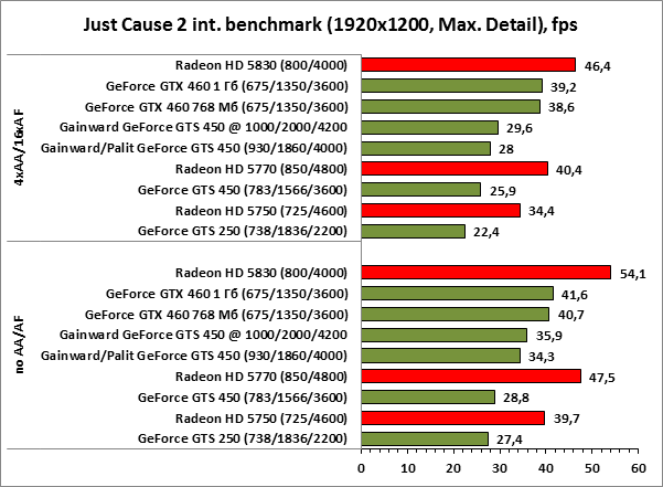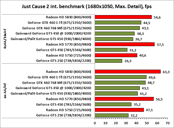 Если в случае Far Cry 2 некогда тотальный перевес решений калифорнийцев сменился примерным паритетом, по крайней мере, среди эталонных версий видеокарт, то в Just Cause 2 преимущество AMD не растаяло. Во всех без исключения режимах Radeon HD 5770 обходит не только эталонный образец GeForce GTS 450, но и разогнанные модификации этого ускорителя. Что же касается прогресса GeForce GTS 450 относительно GeForce GTS 250, то он есть, однако в большей степени проявляет себя только в самых тяжёлых режимах.