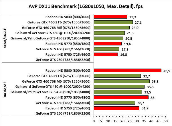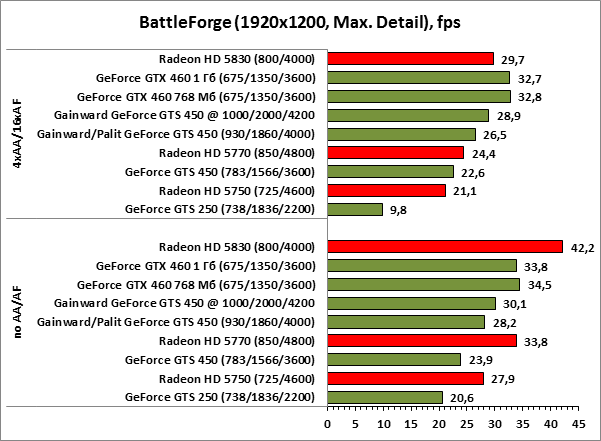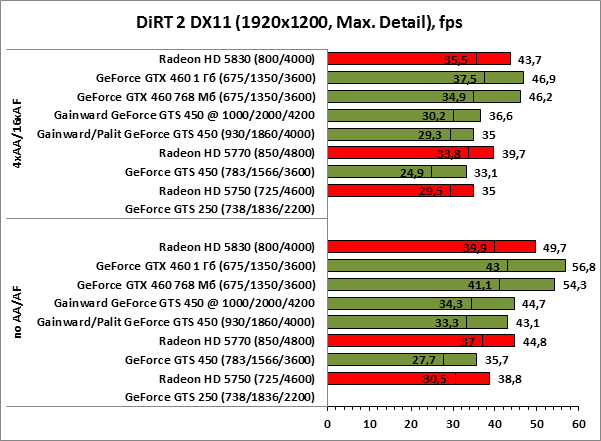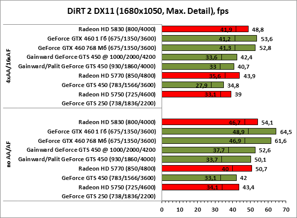 В режимах без сглаживания и фильтрации эталонная версия GeForce GTS 450 слегка уступает Radeon HD 5750, не говоря уже о Radeon HD 5770. Включение сглаживания уравнивает Radeon HD 5750 и GTS 450, однако в копилку GeForce GTS 450 это вряд ли добавит бонусов, поскольку в тяжёлых режимах этот ускоритель неспособен показать достойный fps.