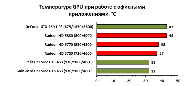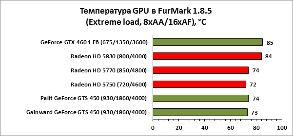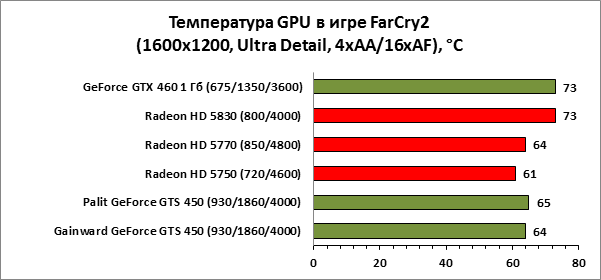 Измерение температуры GPU показало, что графический процессор Palit GeForce GTS 450 Sonic Platinum 1 Гб, равно как и GPU Gainward GeForce GTS 450 GLH 1 Гб, греются ничуть не сильнее, чем видеопроцессор прямого конкурента - Radeon HD 5770. Более того, в режиме офисной работы системы охлаждения, установленные на видеокартах Palit и Gainward, удерживают температуру GPU в районе 32 градусов Цельсия, в то время как GPU эталонных версий Radeon HD 5750 и 5770 прогреваются до 37 и 38°С, соответственно. Стоит также учесть, что в случае с нашими героями их GPU в 3D-режимах работает на повышенных тактовых частотах, в то время как Radeon HD 5750 и Radeon HD 5770 работают без разгона. Что касается шума системы охлаждения, то даже при максимальной нагрузке СО ускоритель производства Gainward работает достаточно тихо и не выделяется из общего шума системы. В случае с продуктом Palit ситуация аналогичная.