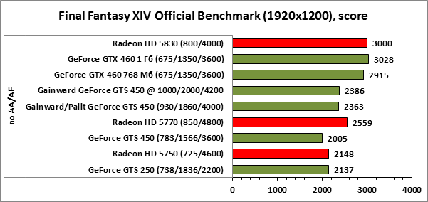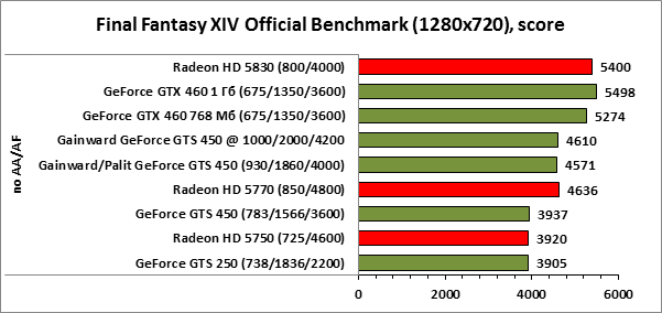 Не так давно мы стали использовать новый тест – Final Fantasy XIV. Тогда работа теста не вызывала нареканий, разве только SLI- и CrossFireX-тандемы не проявляли себя должным образом. В этот раз всё прошло не так гладко. После замены драйверов AMD и NVIDIA на последние версии, мы не смогли провести тестирование в режимах с полноэкранным сглаживанием, поскольку даже после принудительной активации через панель управления драйверами AMD/NVIDIA в Final Fantasy XIV эта функция не работала. Что послужило причиной такого поведения бенчмарка, нам ещё предстоит выяснить, а пока вернёмся к полученным результатам. В этот раз мы провели тестирование не только в максимальном разрешении, но также замеряли производительность всех ускорителей в невысоком разрешении – 1280x720. Итоги таковы: эталонная версия GeForce GTS 450 находится на одном уровне с Radeon HD 5750 в невысоком разрешении и отстаёт от него в максимальном, а разогнанные на заводе ускорители GeForce GTS 450 от Palit и Gainward соревнуются уже с Radeon HD 5770, немного уступая ему в разрешении 1920x1200.