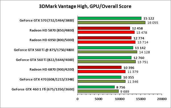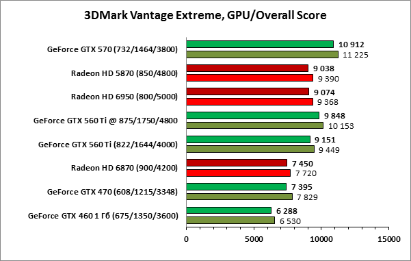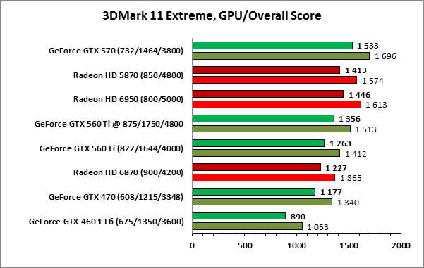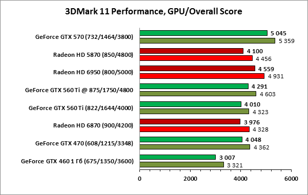 Как и следовало ожидать, GeForce GTX 560 Ti без особого труда расправился со своим предшественником — GeForce GTX 460. Это вполне естественно, учитывая большее количество функциональных блоков и более высокие рабочие частоты. Кроме того, новинка легко обошла и GeForce GTX 470, который достаточно долго оставался лидером в этом ценовом сегменте. Также ускоритель GeForce GTX 560 Ti был быстрее Radeon HD 6870 во всех без исключения режимах. А вот Radeon HD 6950 оказался не такой уж лёгкой добычей, особенно после оптимизаций, заложенных в новом драйвере AMD. Посмотрим, как обстоят дела в новом 3DMark 11.