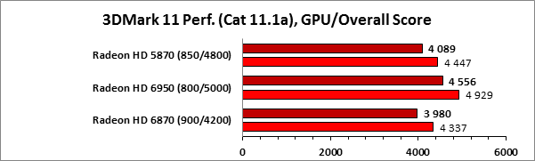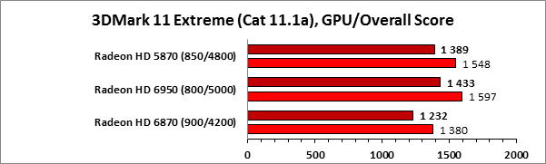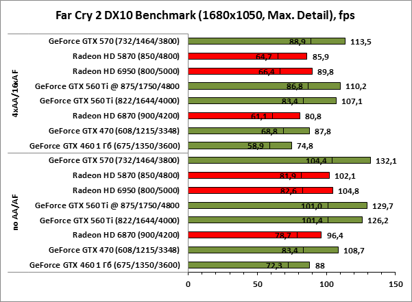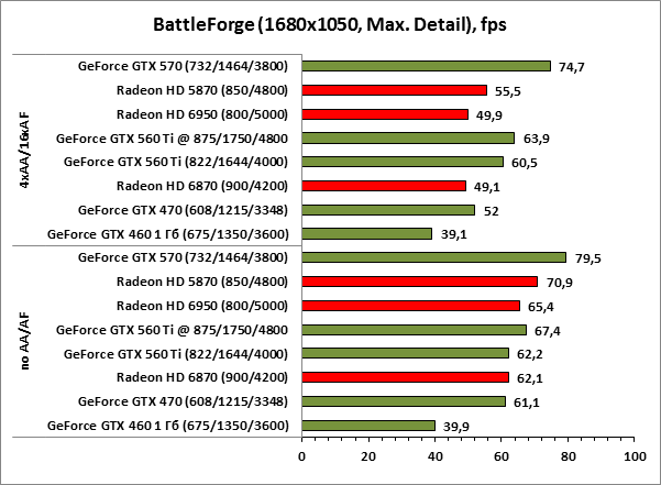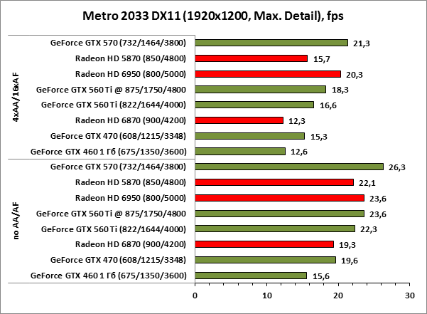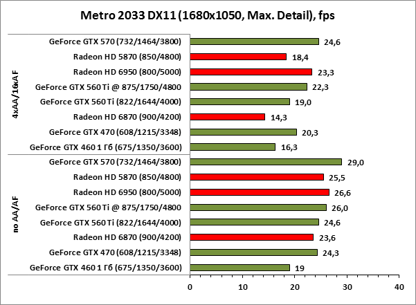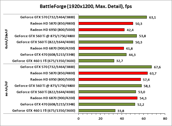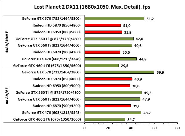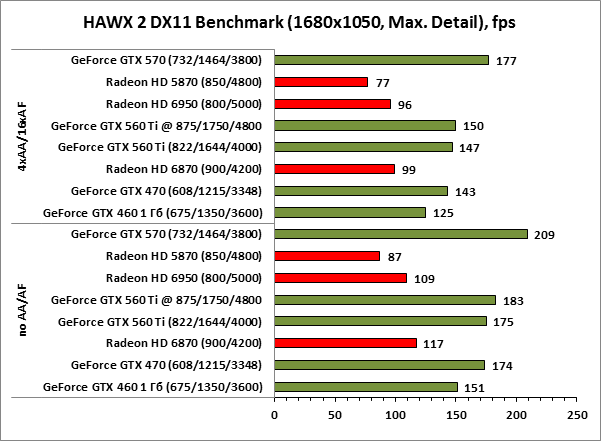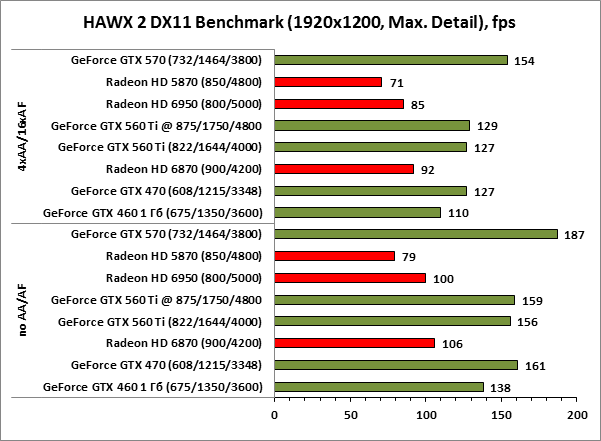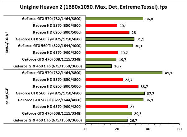Благодаря усиленному блоку тесселяции Radeon HD 6950 заметно опережает своего соратника Radeon HD 5870, однако GeForce GTX 560 Ti всё же оказывается немного быстрее. В большей степени это заметно в разрешении 1680x1050, а при переходе к 1920x1200 разница между результатами этих ускорителей практически стирается.
