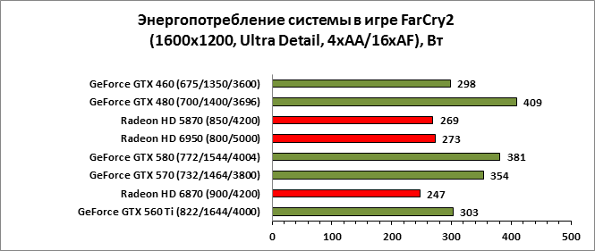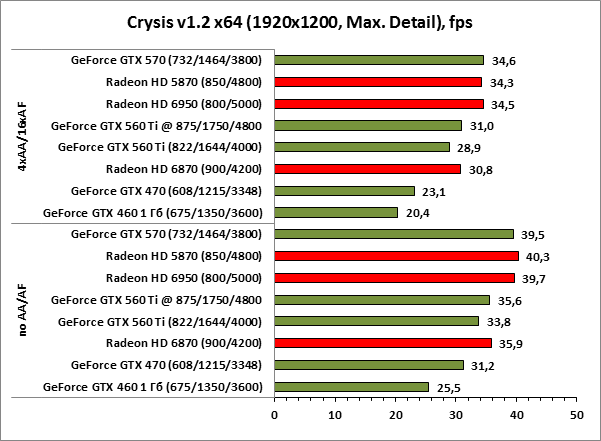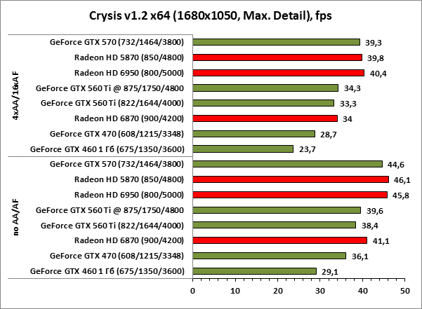 В Crysis же, наоборот, наблюдается общее отставание продуктов NVIDIA, здесь уже Radeon HD 6870 показывает лучшие результаты в сравнении с GTX 560 Ti. При этом новый ускоритель GeForce GTX 560 Ti оказался производительнее GTX 470, что делает его неплохой заменой, по крайней мере если судить по проверенным приложениям.