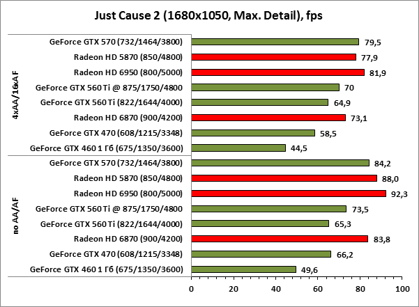 В Just Cause 2 мы наблюдаем небольшое преимущество GeForce GTX 560 Ti над старичком GTX 470, которое выражается величинами порядка 3-5 fps. В то же время семейство ускорителей AMD в целом показывает своё преимущество над оппонентом, например, Radeon HD 6870 оказывается быстрее всех ускорителей NVIDIA, за исключением GTX 570, а Radeon HD 6950 и вовсе стал чемпионом в этом тесте.