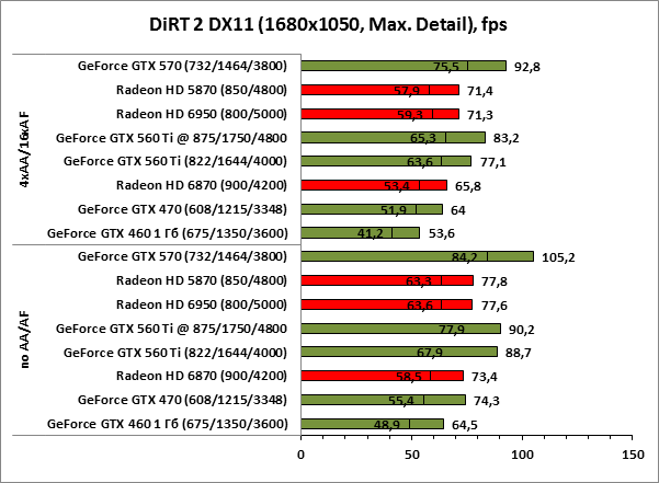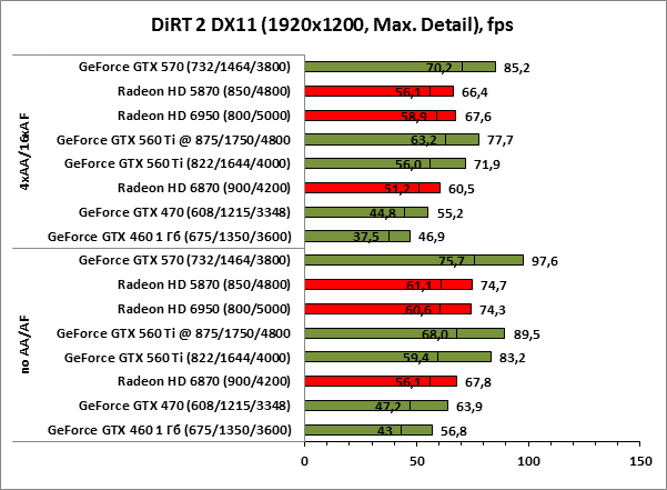 В DiRT 2 ускоритель GeForce GTX 560 Ti занимает одно из лидирующих мест, опережая всех соперников вне зависимости от режима тестирования.