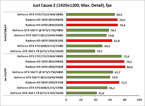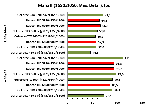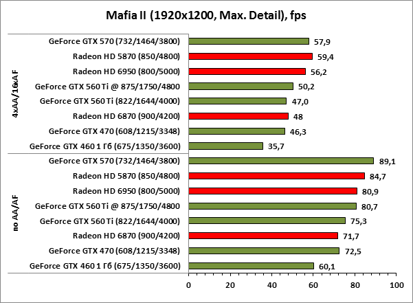 В случае с Mafia II ускоритель GeForce GTX 560 Ti ведёт себя не так уверенно, как, например, в HAWX 2. В режимах без сглаживания и фильтрации GTX 560 Ti немного обходит Radeon HD 6870, а после активации AA/AF идёт практически наравне с Radeon HD 6870. Подобраться к Radeon HD 6950 «Титану» удаётся только после разгона, но и он спасает не всегда.