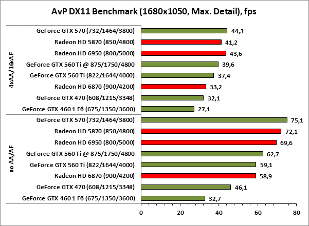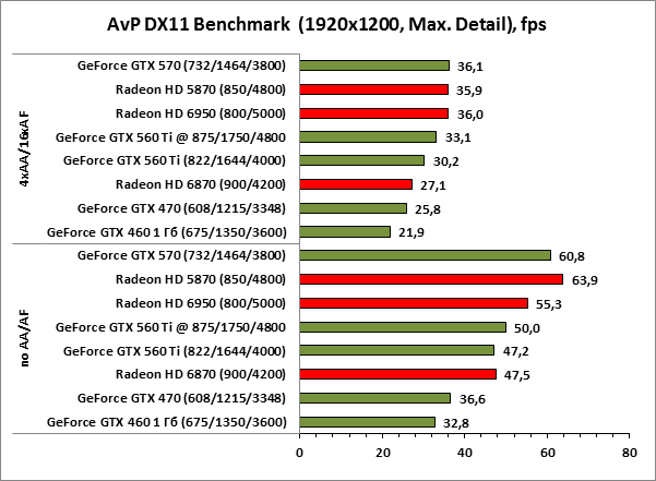 В игре Alien versus Predator ускоритель GeForce GTX 560 Ti выступает на равных с Radeon HD 6870 в лёгких режимах и опережает его в тяжёлых. Однако, вне зависимости от режима, новинка от NVIDIA не в состоянии тягаться с Radeon HD 6950 и Radeon HD 5870, даже после разгона.
