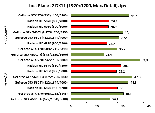 «Движок» Lost Planet 2 ещё более категоричен при расстановке сил, нежели Метро 2033. Безоговорочное лидерство GeForce GTX 560 Ti над решениями конкурента, в том числе и Radeon HD 6950.