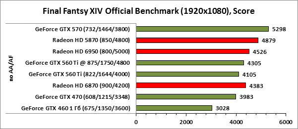 В Final Fantasy XIV ускорители AMD выглядят более уверенно, чем представители NVIDIA. Исключением является разве что ускоритель GeForce GTX 570, который занял лидирующую позицию в этом тесте. Что же касается GeForce GTX 560 Ti, то этот ускоритель, несмотря на некоторое превосходство над GeForce GTX 470, всё же не может на равных тягаться с Radeon HD 6870, по крайней мере, без разгона.
