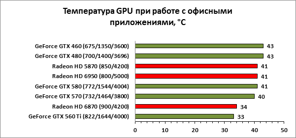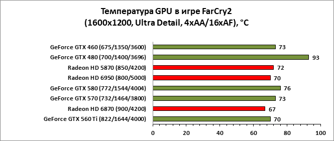 Несмотря на существенно возросшие тактовые частоты, а также большее количество функциональных блоков, GeForce GTX 560 Ti нагревается немного меньше GPU GTX 460, что не может не радовать. При типичной игровой нагрузке новинка от NVIDIA показывает близкие к Radeon HD 6870 результаты. Это стало возможным благодаря не только модернизации графического ядра, но и весьма неплохой системе охлаждения, которая в процессе эксплуатации ускорителя по уровню шума не выделялась на фоне остальных компонентов стенда.