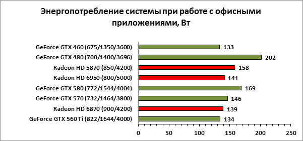 В режиме офисной работы стенд с GeForce GTX 560 Ti по показателю энергопотребления оказался на уровне Radeon HD 6870, Radeon HD 6950 и GeForce GTX 460, что вполне ожидаемо. А вот игровая нагрузка демонстрирует заметную разницу между решениями NVIDIA и AMD. Надо сказать, что все «красные» ускорители с точки зрения «аппетита» оказались скромнее в сравнении с представителями NVIDIA. Тем не менее, и тут прогресс в семействе GeForce налицо. Обратите внимание: несмотря на более высокий уровень производительности в 3D (чтобы это понять, достаточно просто взглянуть на технические характеристики видеокарт), тестовый стенд с установленной видеокартой GeForce GTX 560 Ti потребляет такое же количество энергии, что и аналогичный стенд с GeForce GTX 460. Данный факт свидетельствует о более высоком уровне производительности на ватт потребляемой видеокартой энергии.